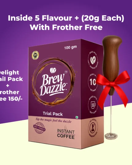 DELIGHT TRIAL PACK | Brew Dazzle Instant Coffee Assortment (100% Arabica, Premium) – 5 Pouches (20g Each) | FREE ₹150 Frother WITH Every Box | Explore 5 Premium Coffee Flavours