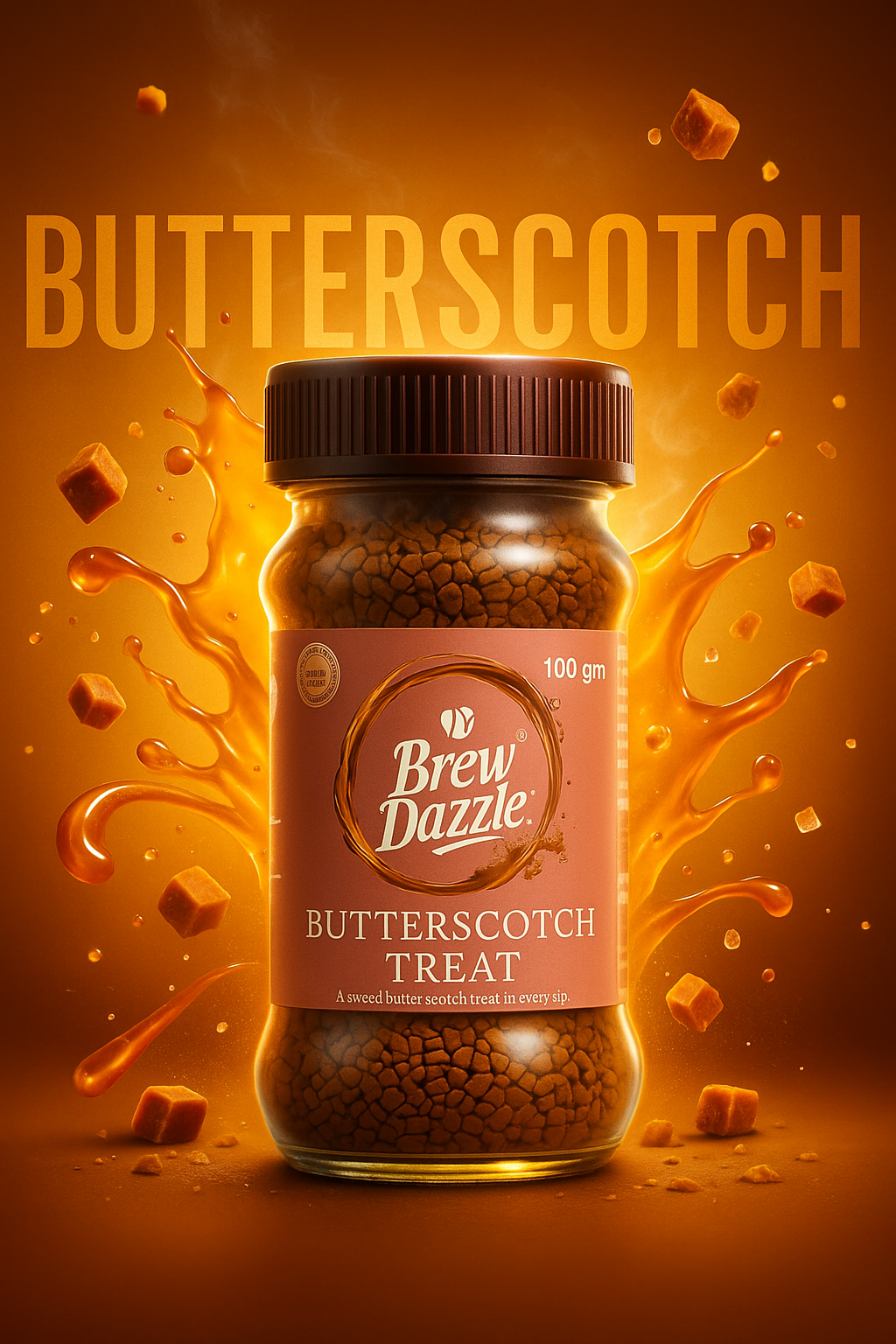 BREWDAZZLE Butterscotch Treat Instant Coffee Granules is a delightful blend of premium Arabica coffee and rich butterscotch flavor, perfect for coffee lovers who enjoy a sweet, aromatic twist. This instant coffee dissolves easily in hot water or milk, offering a quick and convenient way to enjoy your favorite coffee. Available in 50g, 100g, and 200g , 1kg packs, it’s ideal for morning refreshment, office breaks, or cozy evening indulgence. Sip the magic, feel the dazzle with every cup of BREWDAZZLE Butterscotch Treat Instant Coffee Granules, and enjoy a flavorful experience that brightens your day.